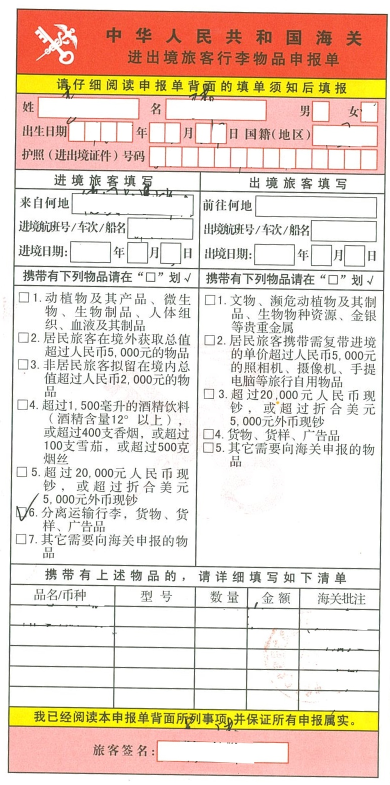 中華人民共和國海關(guān)進出境旅客行李物品申報單(樣例)