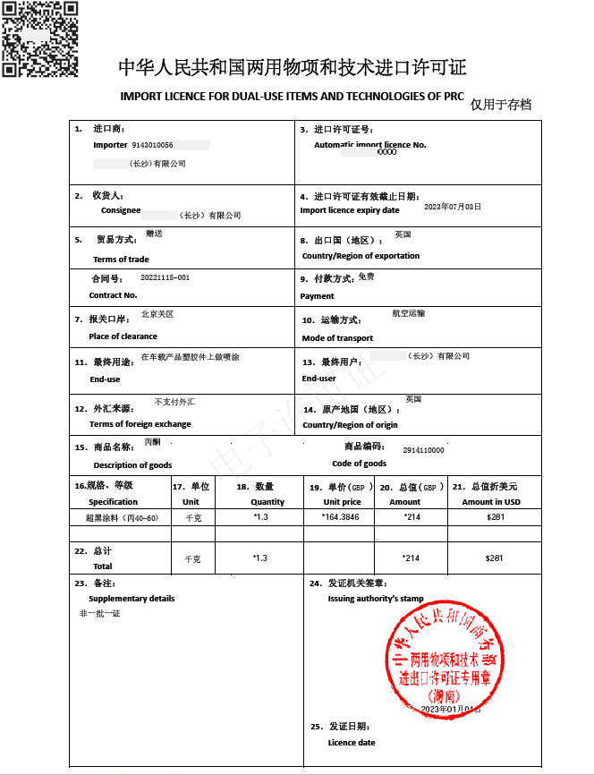 中華人民共和國兩用物項和技術(shù)進(jìn)口許可證(樣例)