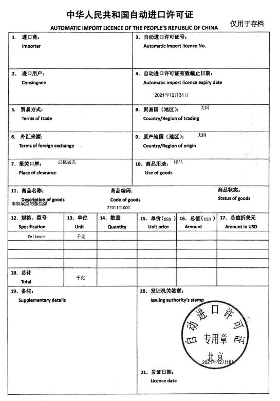 礦產(chǎn)資源-自動(dòng)進(jìn)口許可證(樣例)