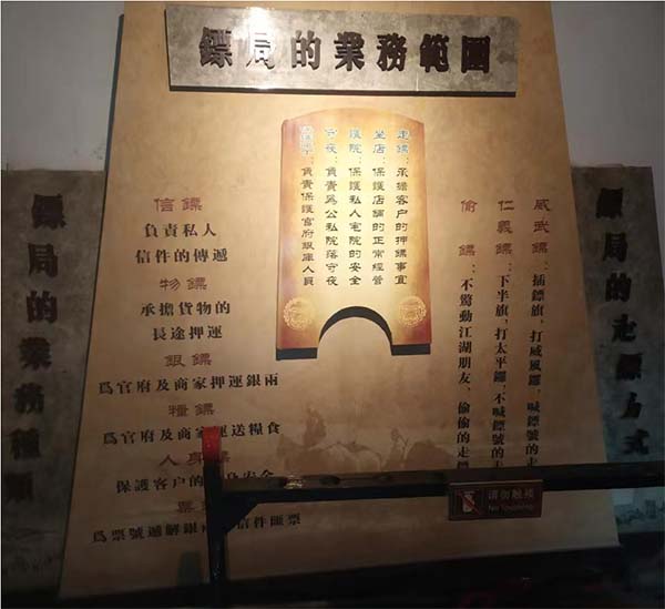 其次我們?nèi)チ酥袊S局博物館和日升昌票號(hào),中國鏢局博物館它全面地講述了鏢局的發(fā)展歷史,介紹了鏢局在封建社會(huì)后期對(duì)商品流通領(lǐng)域做出的特殊貢獻(xiàn)。從鏢局的業(yè)務(wù)范圍,我們可以了解到古代鏢局的責(zé)任之重大。日升昌票號(hào)。它是銀行業(yè)的鼻祖,也是中國民族銀行業(yè)的先河??吹竭@些也正是我們物流行業(yè)所涉及到的,我們也要牢記使命,做到客戶至上、服務(wù)至上。