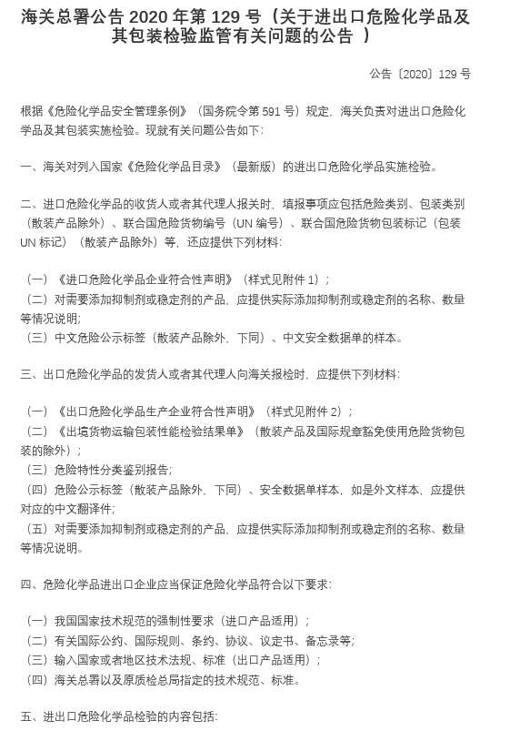 海關(guān)總署公告2020年第129號(hào)(關(guān)于進(jìn)出口危險(xiǎn)化學(xué)品及其包裝檢驗(yàn)監(jiān)管有關(guān)問題的公告 )