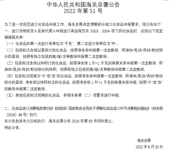 海關總署公告2022年第51號 (關于調整部分進口化妝品申報要求的公告)