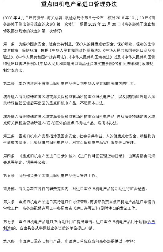 重點(diǎn)舊機(jī)電產(chǎn)品進(jìn)口管理辦法