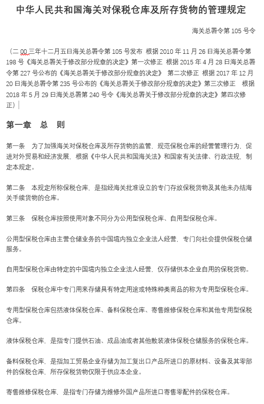 中華人民共和國海關對保稅倉庫及所存貨物的管理規(guī)定