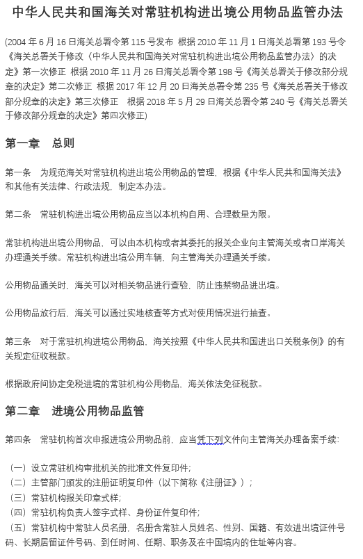 中華人民共和國海關(guān)對常駐機構(gòu)進(jìn)出境公用物品監(jiān)管辦法