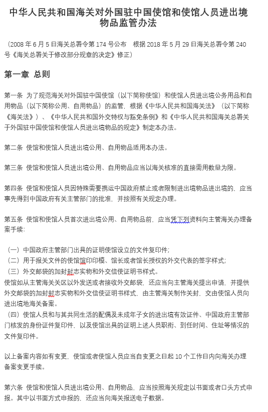 中華人民共和國(guó)海關(guān)對(duì)外國(guó)駐中國(guó)使館和使館人員進(jìn)出境物品監(jiān)管辦法