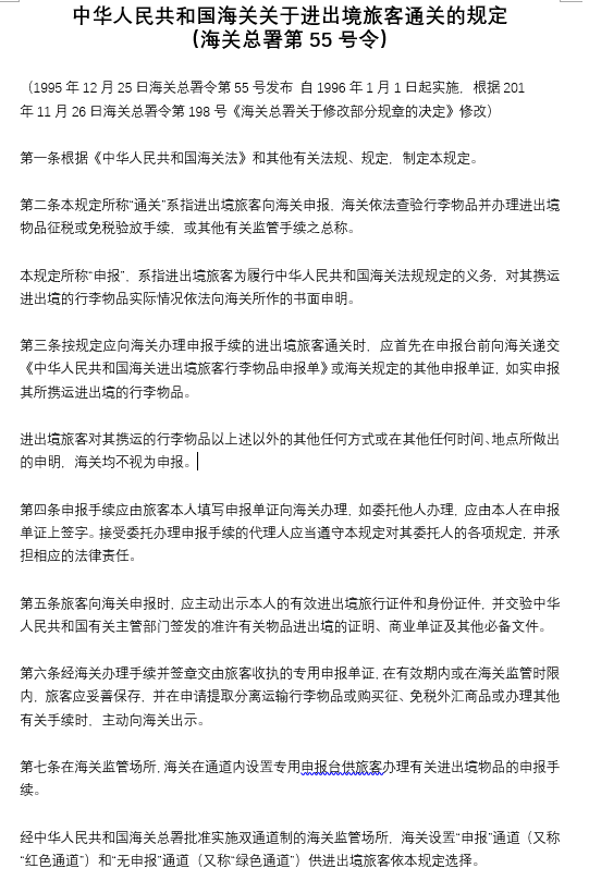 中華人民共和國海關(guān)關(guān)于進(jìn)出境旅客通關(guān)的規(guī)定 (海關(guān)總署第55號令)
