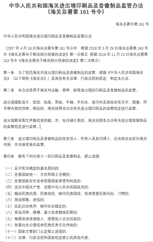 中華人民共和國(guó)海關(guān)進(jìn)出境印刷品及音像制品監(jiān)管辦法(海關(guān)總署第161號(hào)令)