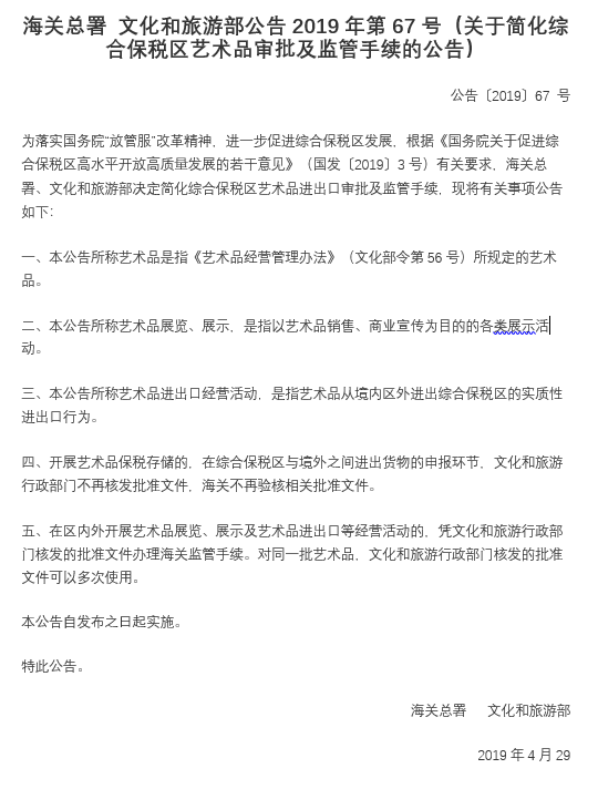 海關(guān)總署 文化和旅游部公告2019年第67號(hào)(關(guān)于簡(jiǎn)化綜合保稅區(qū)藝術(shù)品審批及監(jiān)管手續(xù)的公告)