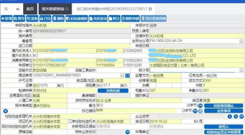 這時(shí),大興海關(guān)的張科長(zhǎng)成了我們的大救星。為了幫助我們,他在海關(guān)辦公室面對(duì)著海關(guān)報(bào)關(guān)系統(tǒng)的界面,用電話一步一步地指導(dǎo)我們的人逐項(xiàng)按照要求填寫(xiě)正確的新的數(shù)據(jù)項(xiàng)。比如,“申報(bào)地海關(guān)”和“進(jìn)境關(guān)別”必須填寫(xiě):大興機(jī)場(chǎng)?!皺z驗(yàn)檢疫受理機(jī)關(guān)”、“領(lǐng)證機(jī)關(guān)”和“口岸檢驗(yàn)檢疫機(jī)關(guān)”必須填寫(xiě):大興機(jī)場(chǎng)海關(guān)本部。具體申報(bào)界面,如下圖所示: